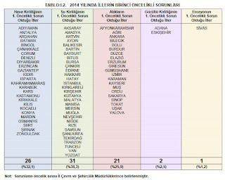 Bakanlığın raporuna göre Türkiye’de su kirliliğinin öncelikli sorun olduğu il sayısı 31. Bir başka deyişle tüm illerin yüzde 38’inde su kirliliği sorunu var. Bu sorunu hava kirliliği izliyor. Türkiye’nin 26 ilinde hava kirliliği en büyük çevre sorunu. 21 ilde ise atıklar en büyük sorun. Gürültü kirliliğini en önemli problem kabul eden il sayısı iki; Eskişehir ve Adana. Sivas ise en önemli çevre sorununun erozyon olduğunu söyleyen tek il. Bu sonuçlar hem bakanlığın hem de ilgili kurumların anketlere verdiği yanıtlardan elde edilmiş. Sokaktaki insanın algısı değil, bizzat konularla uğraşan kişilerin görüşleri.